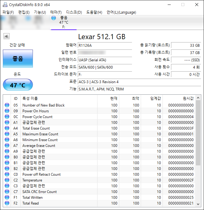 총 읽기 량과 기록량, 사용 횟수와 시간을 통해 자료를 얼마나 사용했는지, 사용한 시간은 어느 정도인지 추측이 가능합니다. 새 제품을 샀는데 총 읽기/쓰기 량이 0GB가 아닌 경우도 있는데 이는 공장에서 출고 전 테스트를 해서 그런 걸 수도 있으니 크게 놀라시지 않아도 됩니다.