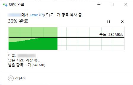 SSD의 성능을 간단히 확인해봤습니다. 좌측은 크리스털 디스크마크를, 우측에는 Windows에서 압축한 파일을 옮겼을 때 찍은 스크린 샷으로, 적당한 속도를 보여주고 있습니다. 물론 SSD의 남은 공간이나, 옮기는 파일, 성능을 측정하는 프로그램이나 케이블 등 다양한 요인으로 인해 실제 속도는 사진과 다를 수 있단 점 참고하시길 바랄게요.