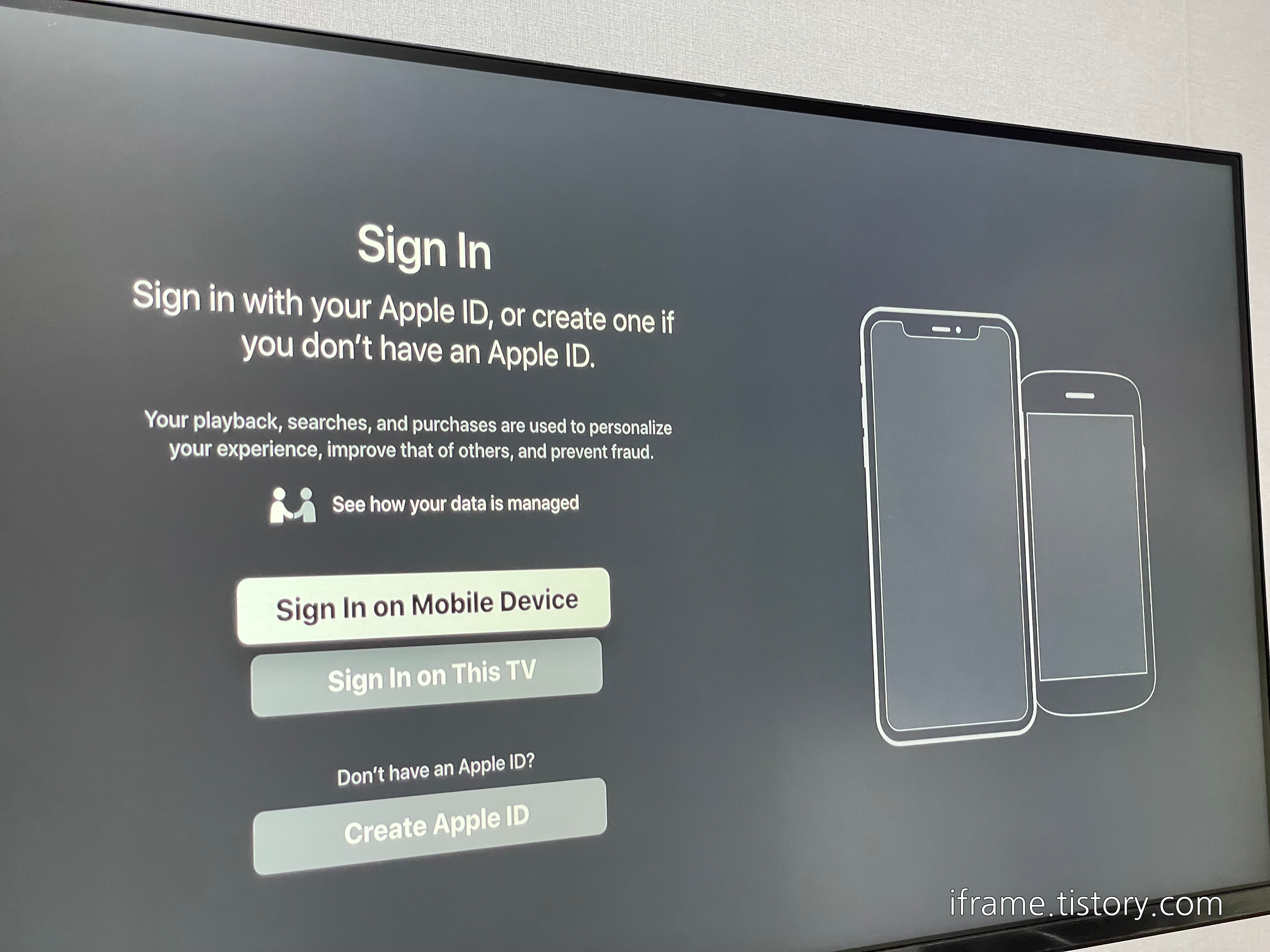 모바일 기기에서 로그인을 할 건지, TV에서 직접 로그인을 할지 물어보는데 편한 방법으로 진행하시면 됩니다. Apple ID가 없을 경우 생성해야 사용할 수 있어요.