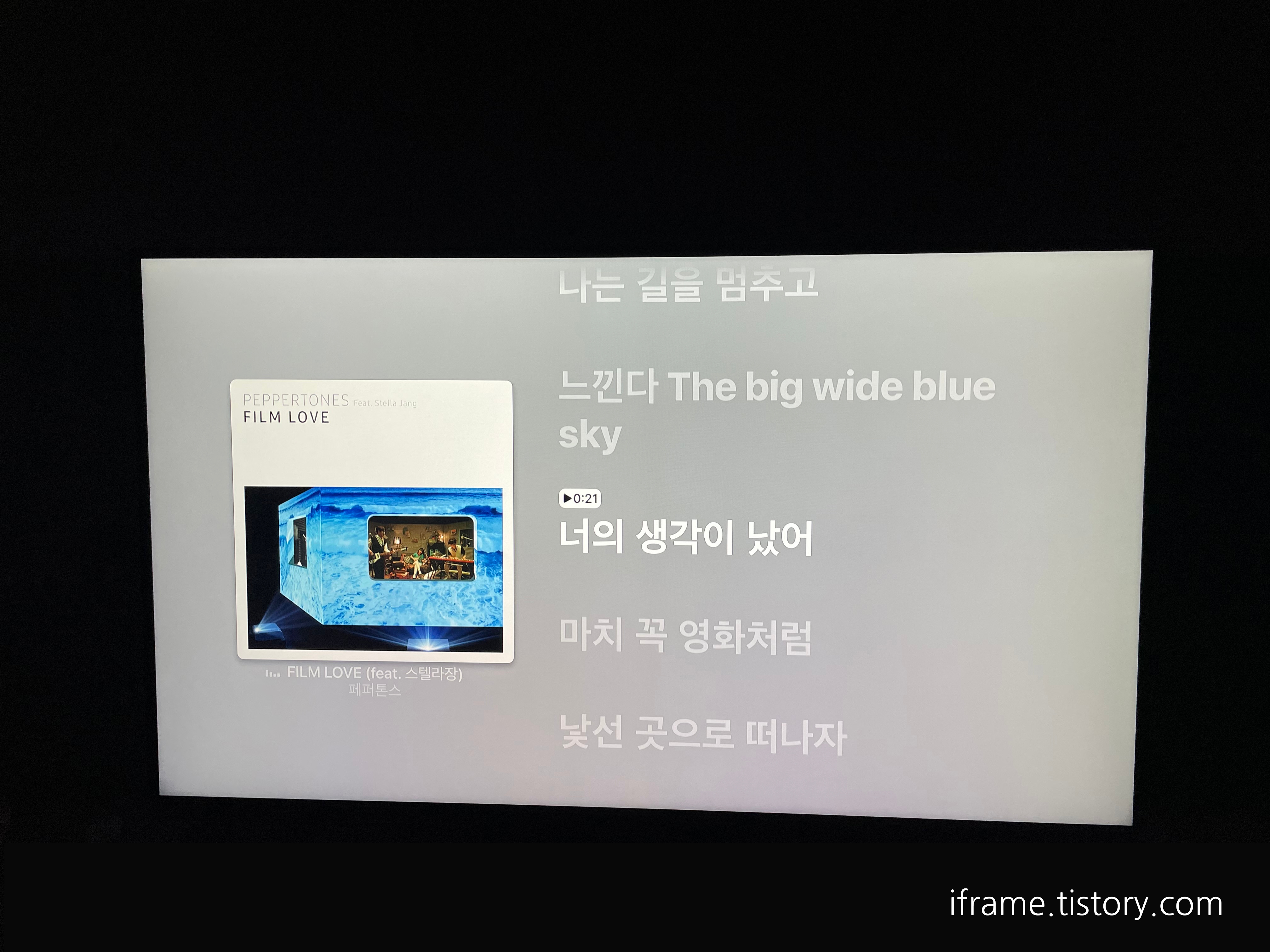 음악을 재생해봤습니다. Mac이나 iPhone에서 봤던 움직이는 가사는 TV에서도 볼 수 있으며, 리모컨을 활용하여 탐색도 가능합니다. AirPlay를 사용하여 Apple Music을 사용하면 이런 가사 창을 볼 수 없었는데 Apple TV 본체가 없어도 특정 삼성/LG TV에 설치된 앱을 사용하면 가능하답니다. 노래방 느낌까지는 아니어도 TV를 보면서 가볍게 흥얼거리기도 좋겠죠.
