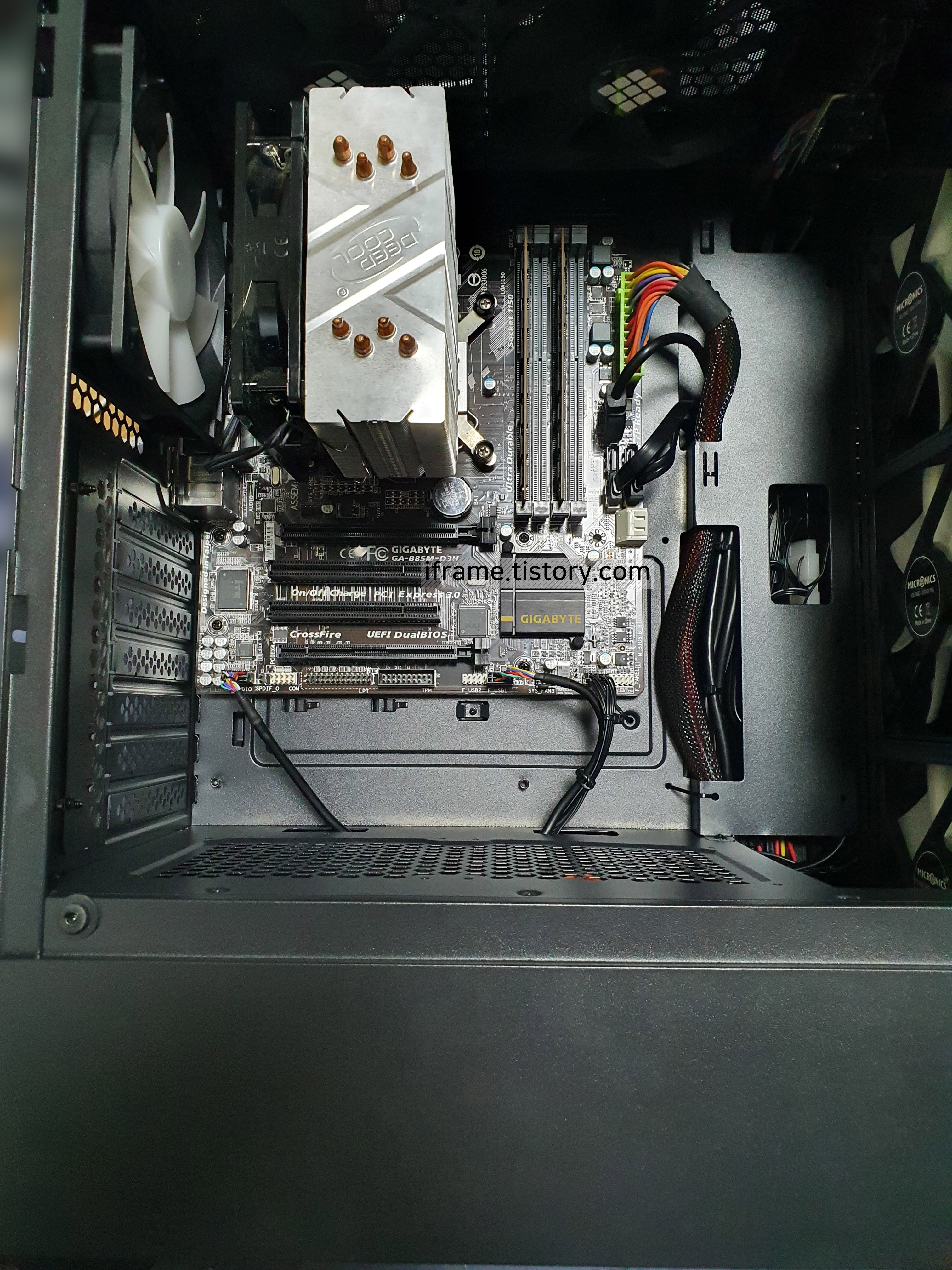 아쉽게도 조립 전 사진은 따로 없지만, 조립 후 사진을 찍어봤습니다. 케이블의 대부분을 후면에 최대한 집어넣었으며, 각종 헤더(오디오, USB 등)는 아래로 선을 빼놨습니다. 개인적으로 어려웠던 것은 메인보드의 보조 전원(CPU 쿨러 좌측 위치)으로, 선을 끼우기 위해 손을 틈에 끼워서 하다 보니 손등에서 피가 났습니다...;; 장갑 끼는 게 귀찮아도 꼭 해야 되는 걸 느꼈습니다.
