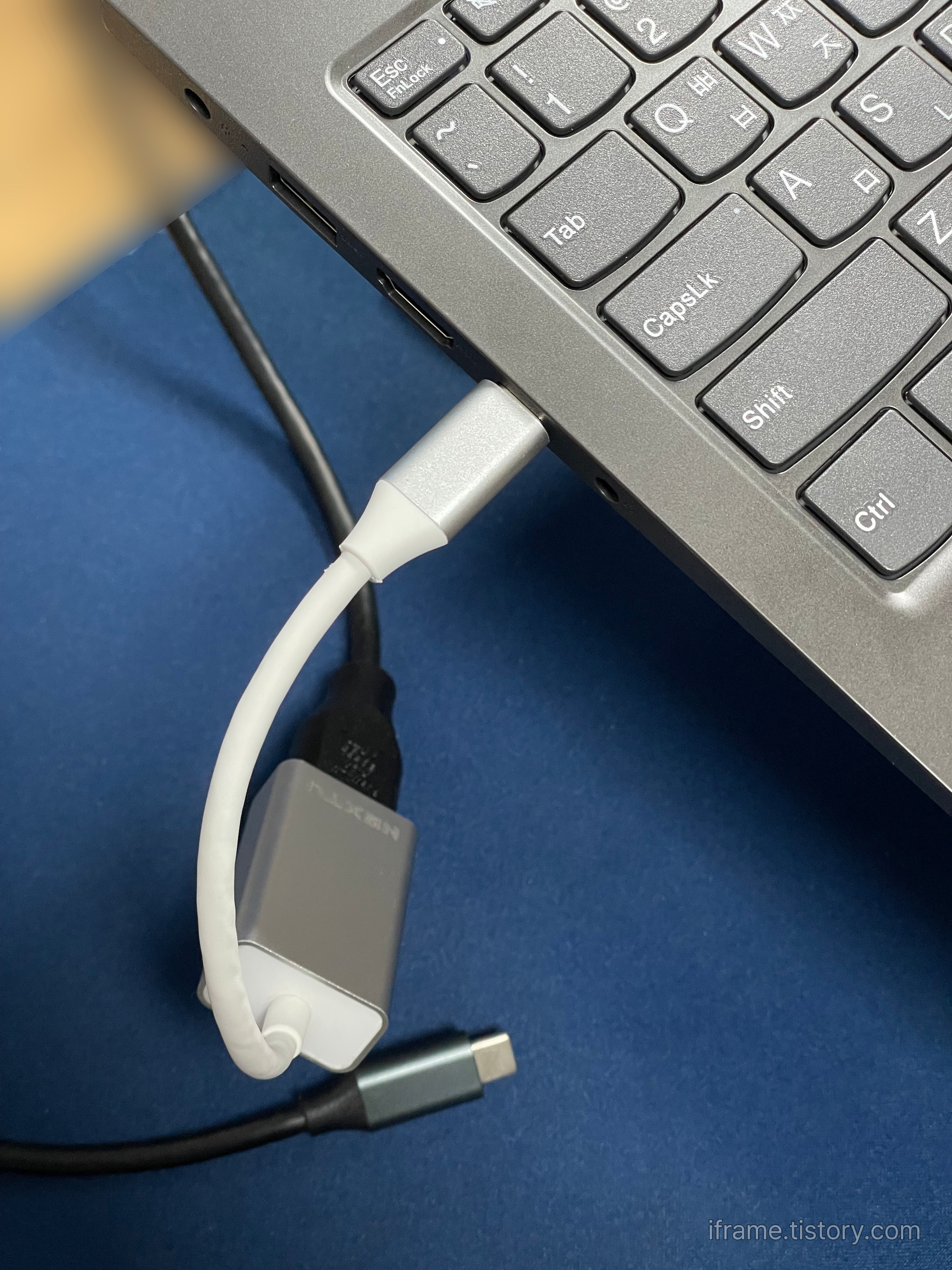 노트북도 요즘 들어 USB-C를 많이 사용하는데요. 단순 파일 전송만 되는 포트에선 사용하기 어렵겠지만 DP 출력을 지원한다면 컨버터만 끼워서 사용할 수 있습니다. 사진의 노트북은 HDMI 포트가 있지만 테스트를 위해 해당 포트를 사용하지 않은 상태에서 연결했답니다.