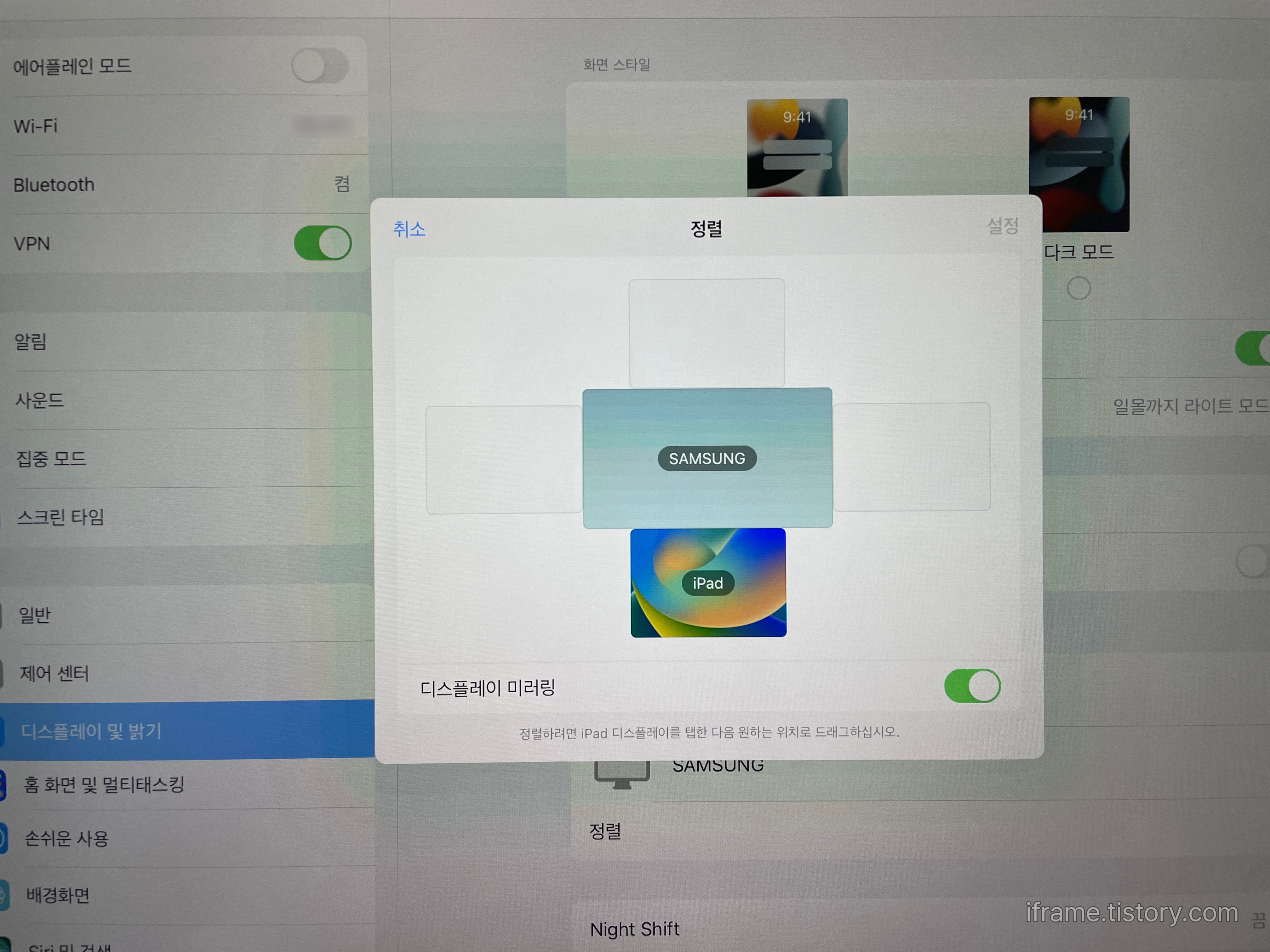 팁: iPad를 모니터에 연결하는 경우 4:3의 화면비를 사용하는 아이패드의 화면 그대로 모니터에 출력되기 때문에 설정-디스플레이 및 밝기-정렬에서 미러링을 끄면 확장 모드로 작동합니다.