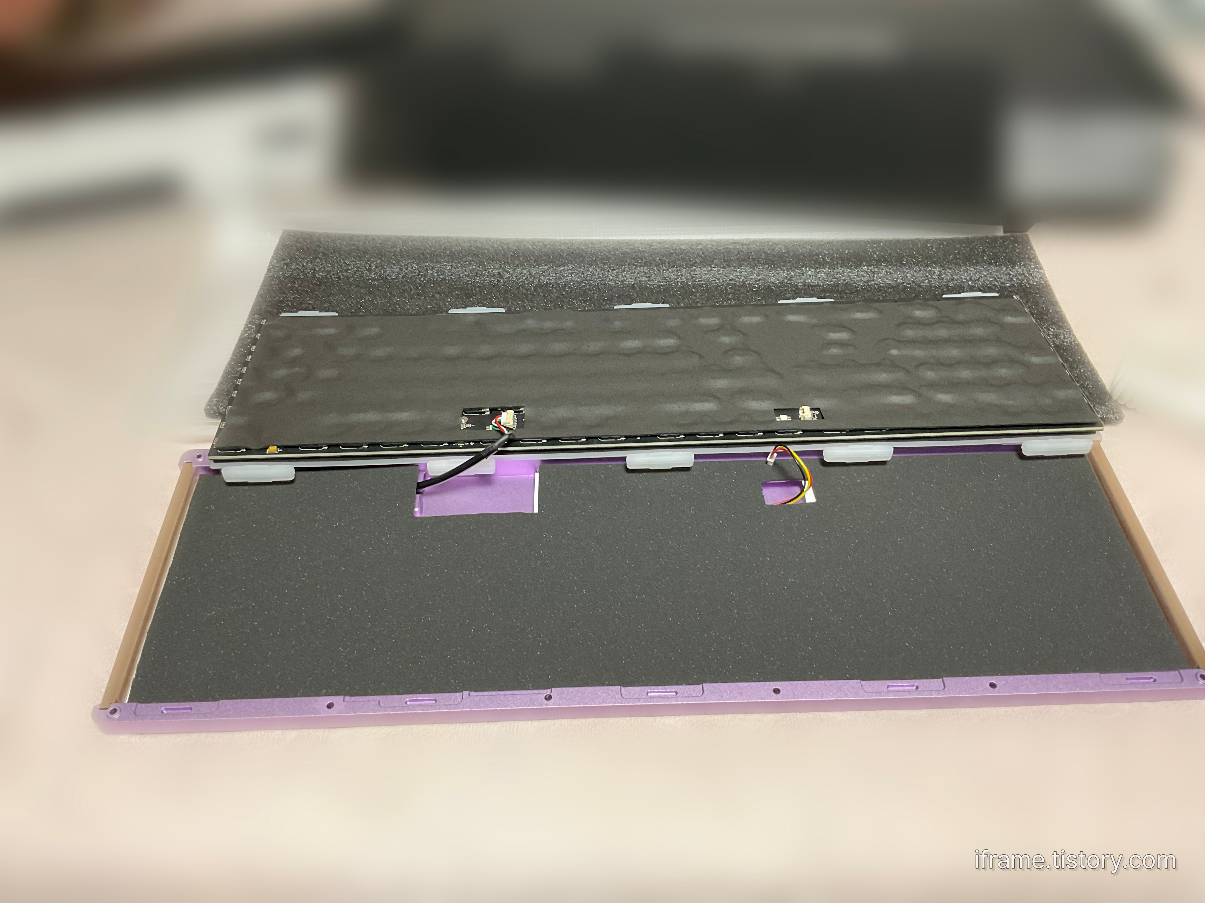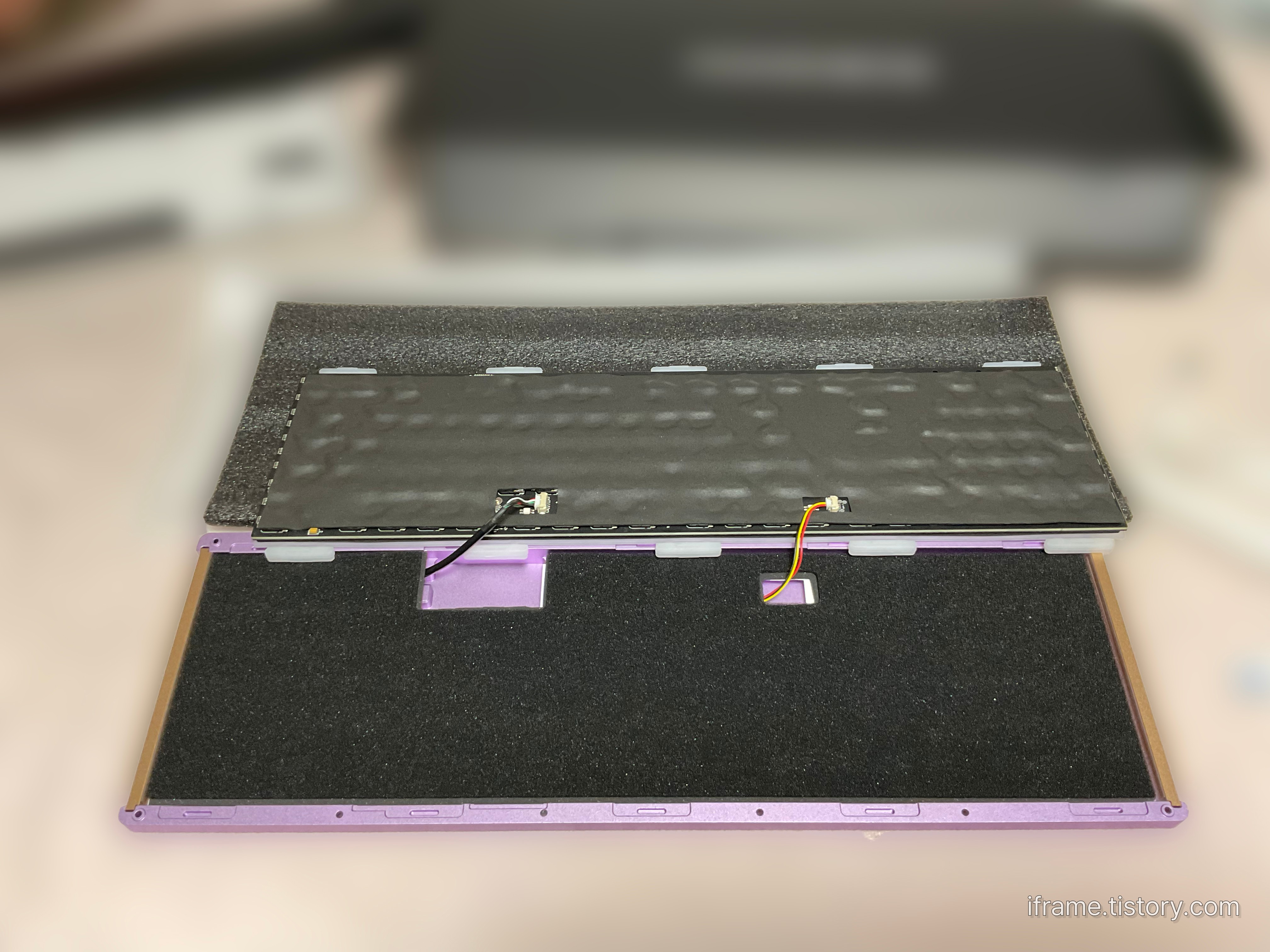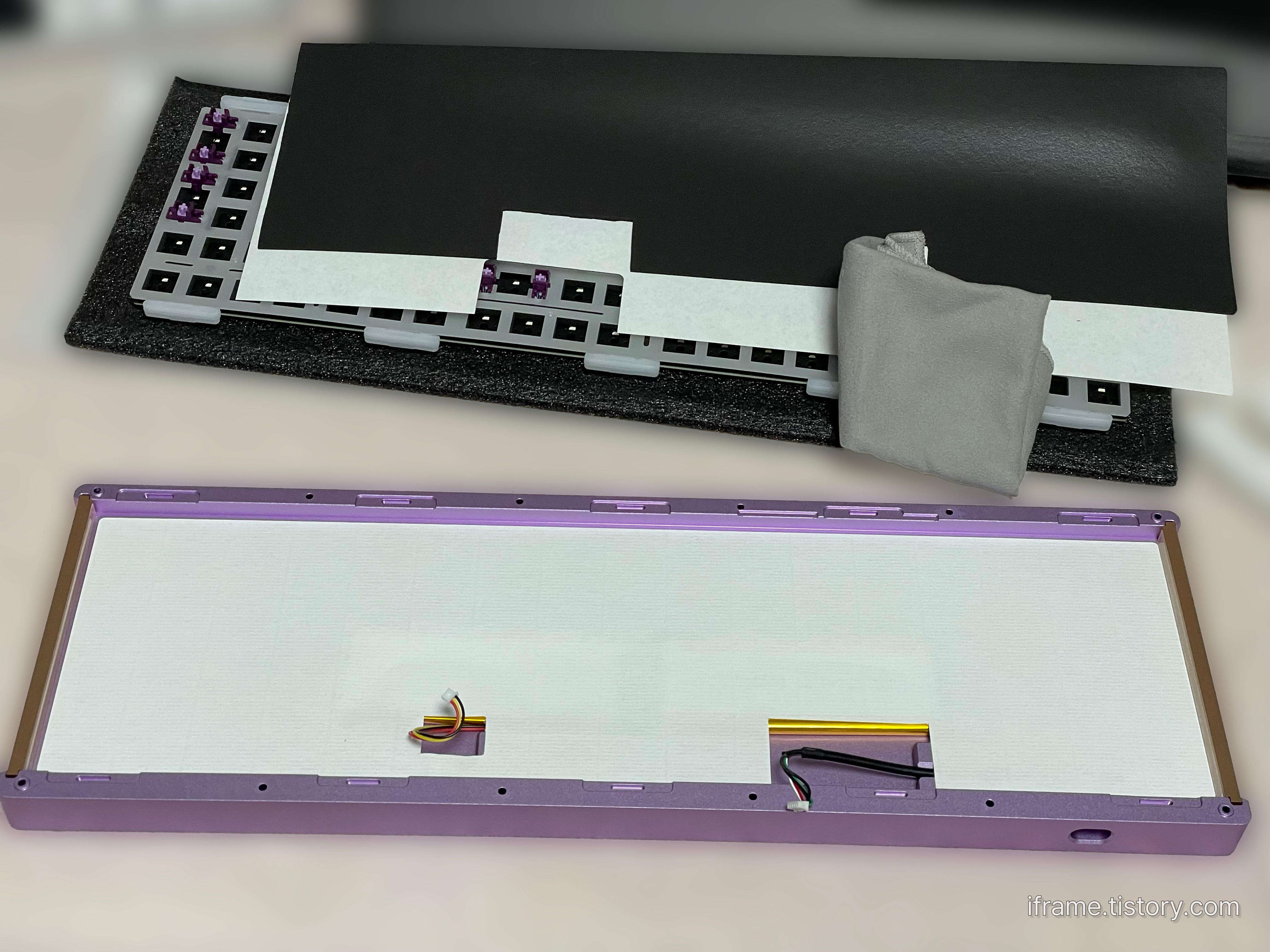 기본 제공되는 흡음재는 빼고, 새로 구매한 것을 놓았습니다. 기판 및 배터리 케이블은 쉽게 빠지는 구조는 아닌 만큼 처음 뺄 땐 잘 안 빠지는 것 같더라고요. 기판 긁지 않도록 핀셋 등으로 살살 뺐습니다. 이후 끼우는 건 어렵진 않은데, 우측 배터리 케이블이 하우징 등에 끼일까 봐 신경을 좀 썼었네요.