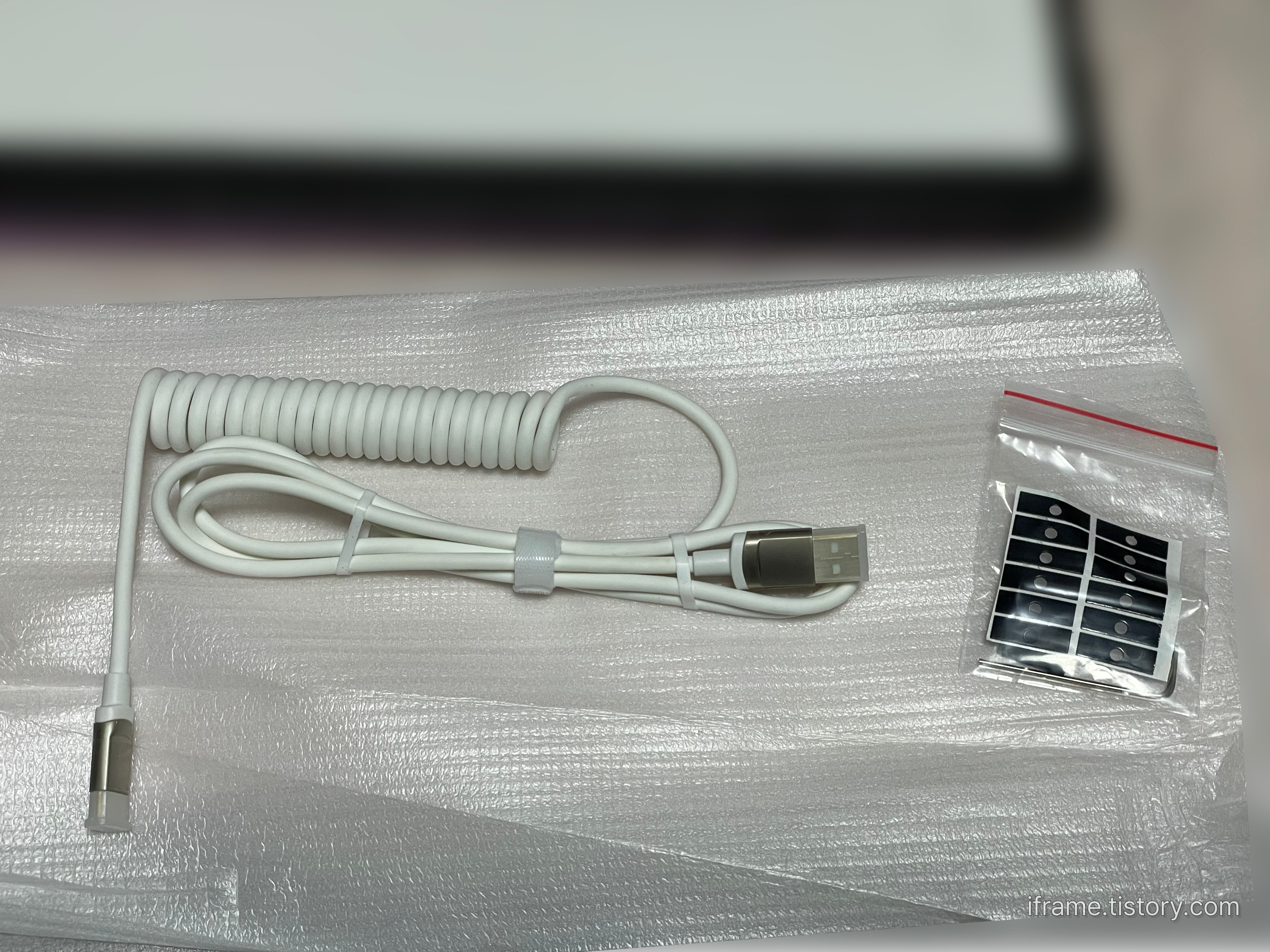 박스를 열면 키보드, 설명서, USB 동글 및 케이블, 렌치 등이 들어 있습니다. USB-C 케이블을 사용하며, 코일처럼 감긴 형태로 제공되는 케이블이 인상적이네요. 스테빌라이저는 키보드에 조립되어 있어서 따로 하지 않았습니다.