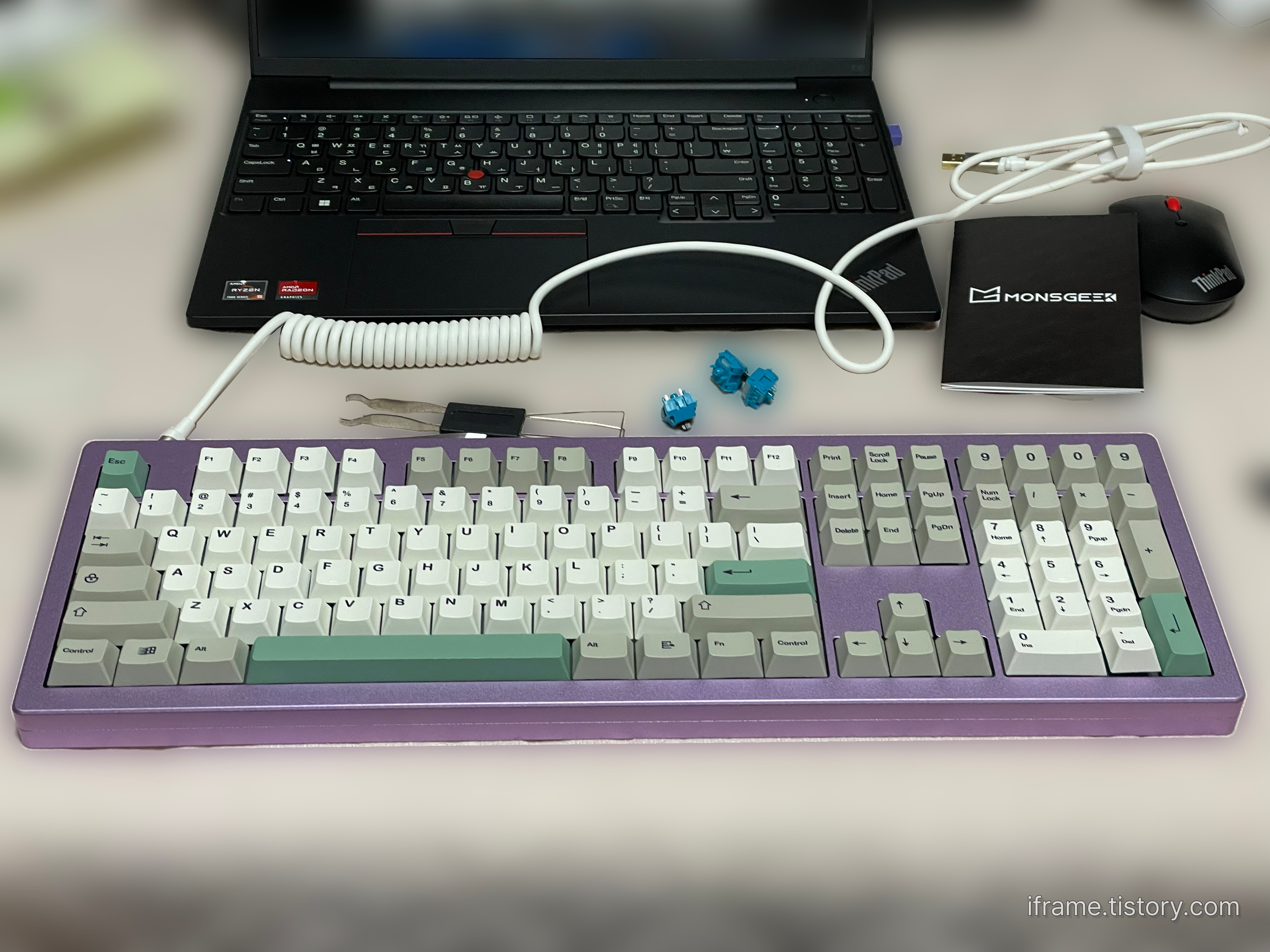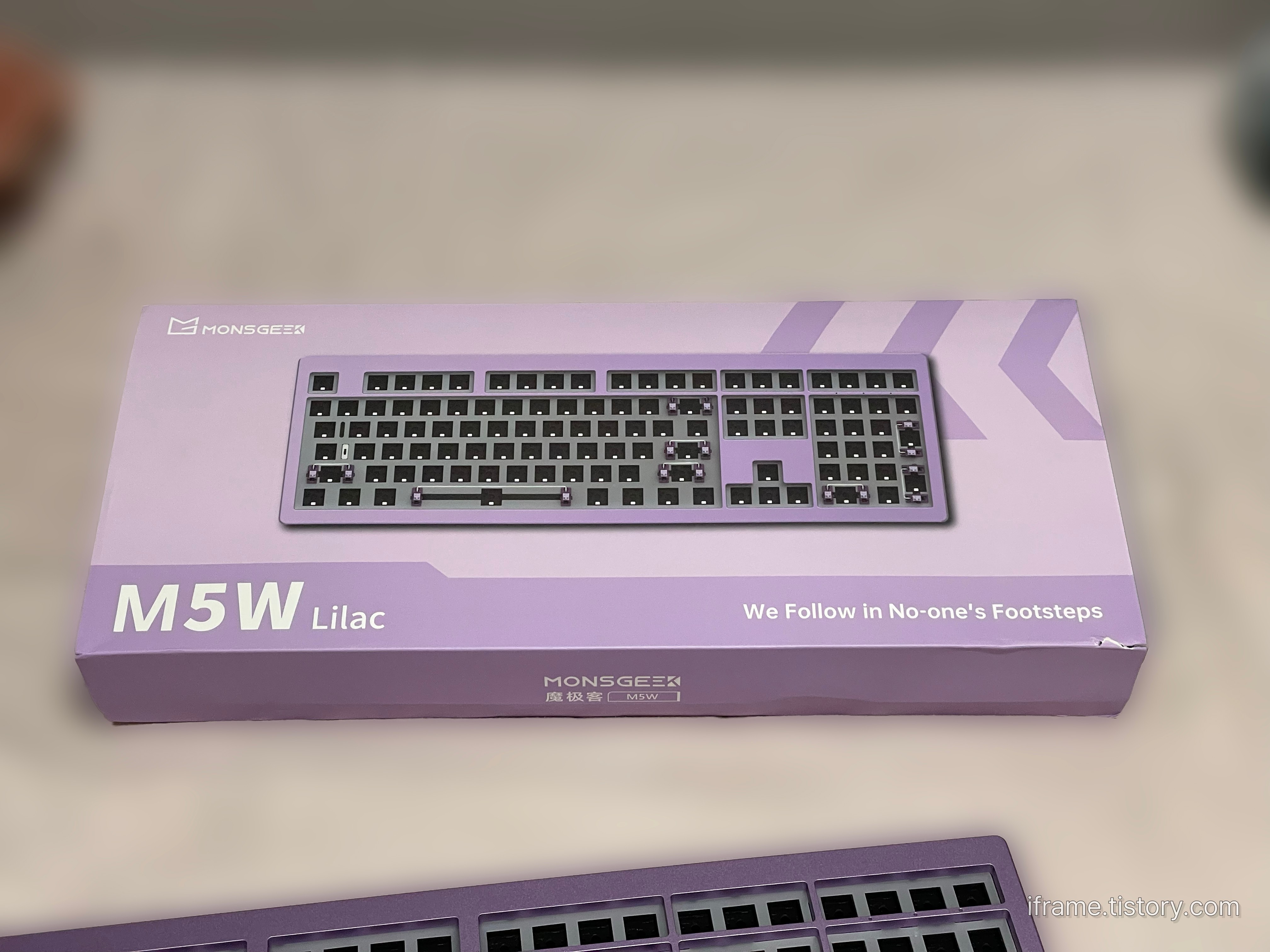 ... 방금 언급했던 제품들에 후기나 뭐 사용기라도 남길까 했었는데 그럴 여유도 없기도 하고, 이미 다른 글이나 영상도 많아서... 제가 키보드를 잘 안다면 관련 글을 많이 올렸을 거예요. 어쨌든 이번에는 (24년)3월 신상인 몬스긱의 M5W 모델을 사서 스위치와 키캡 등을 끼웠습니다. 반은 조립이라고 제목에 되어 있는 것은 키보드가 베어본 상태로 판매되는 것이라 그렇답니다.