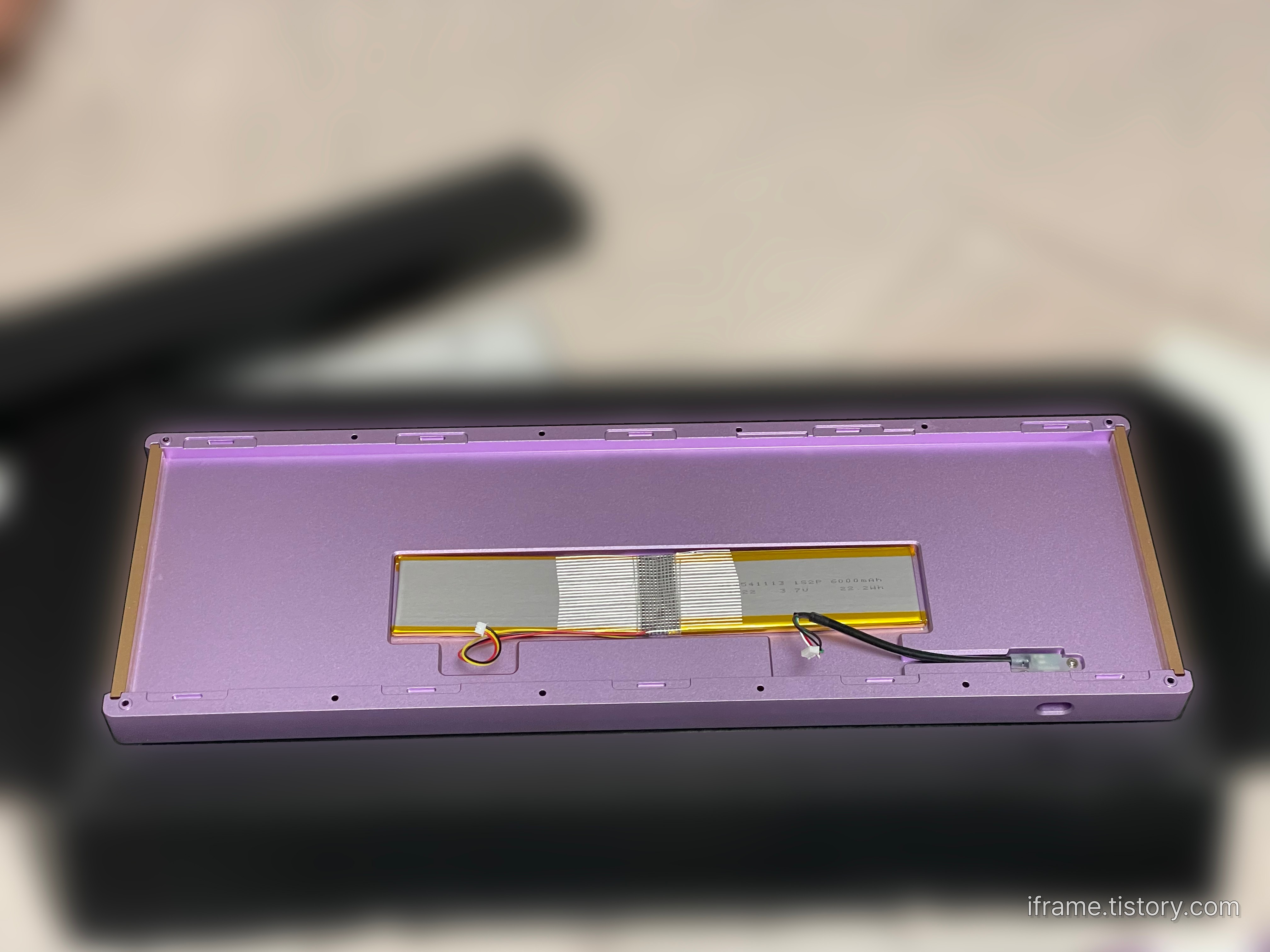 뒤판을 열면 배터리가 들어 있습니다. 6000mAh 배터리가 2개 연결되어 있는 것 같습니다. 확실히 키보드 크기가 있는 만큼 배터리가 들어가도 공간이 넉넉해 보이며, 키보드 내부에는 흡음재와 쇼트 방지용 필름이 들어 있습니다.