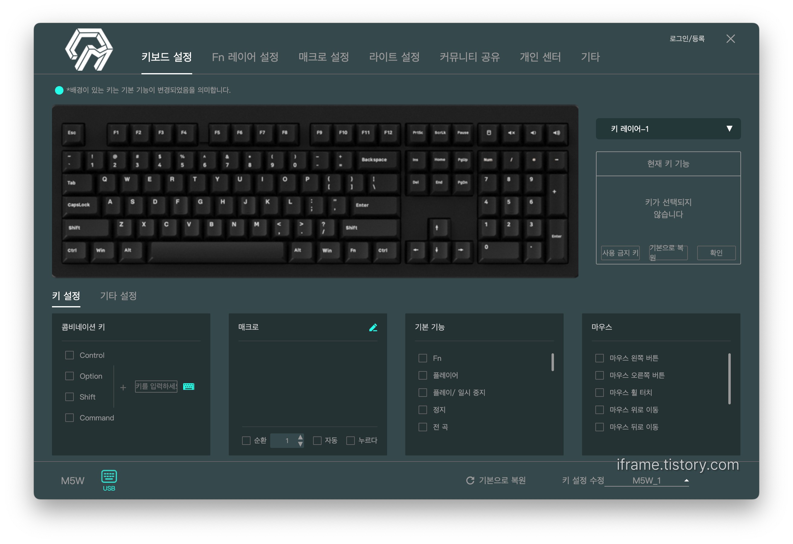 알리에서 사 온 키캡을 끼우며, 설명서 보면서 간단히 세팅하고, 프로그램도 설치해 봤습니다. macOS도 드라이버가 있긴 한데 M5W는 지원하지 않는지 인식이 안 되길래 전에 샀던 노트북을 가져와서 연결했습니다. 드라이버는 필수는 아니니 필요하면 받아서 사용해 보세요.