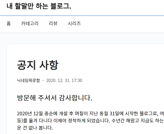 블로그 이름이나 주제, 글은 얼마나 쓸지를 두고 생각이 많았는데 저는 짧게 생각하고 바로 만들었습니다. 근데 이름이 HTML의 태그 중 하나를 사용해서 지었는데 너무 성의 없어 보여서 블로그를 시작했던 그 의도를 살려서 이름을 바꿨습니다. 내 할 말은 열심히 하는 블로그가 됐네요.
