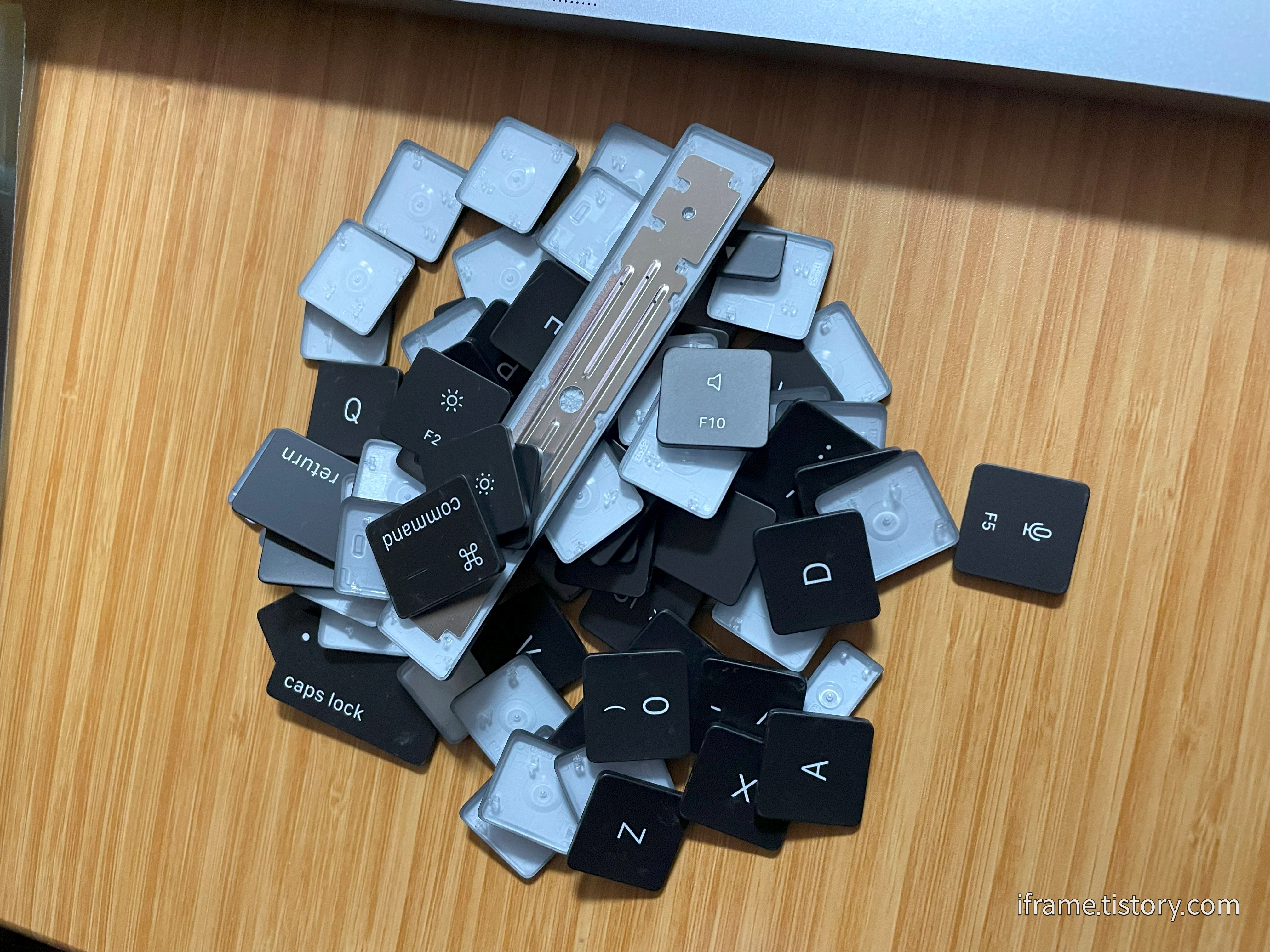 대략 몇 년 전에도 키캡을 교체를 한 적이 있었는데 여기서 설명하기엔 기니까 링크를 확인해 주세요. → 맥북 키보드를 영어로 교체한 후기. 이 때도 제가 웬만하면 작업을 권장하지 않는다고 했었을 거예요. 물론 지금도 작업을 권장하지 않지만... 작업 과정을 설명하고 싶어도 자료가 부족해서 쉽지 않은데, YouTube에 올라온 영상이 저보다 설명을 더 잘해 주시니 그걸 참고해서 작업했거든요.