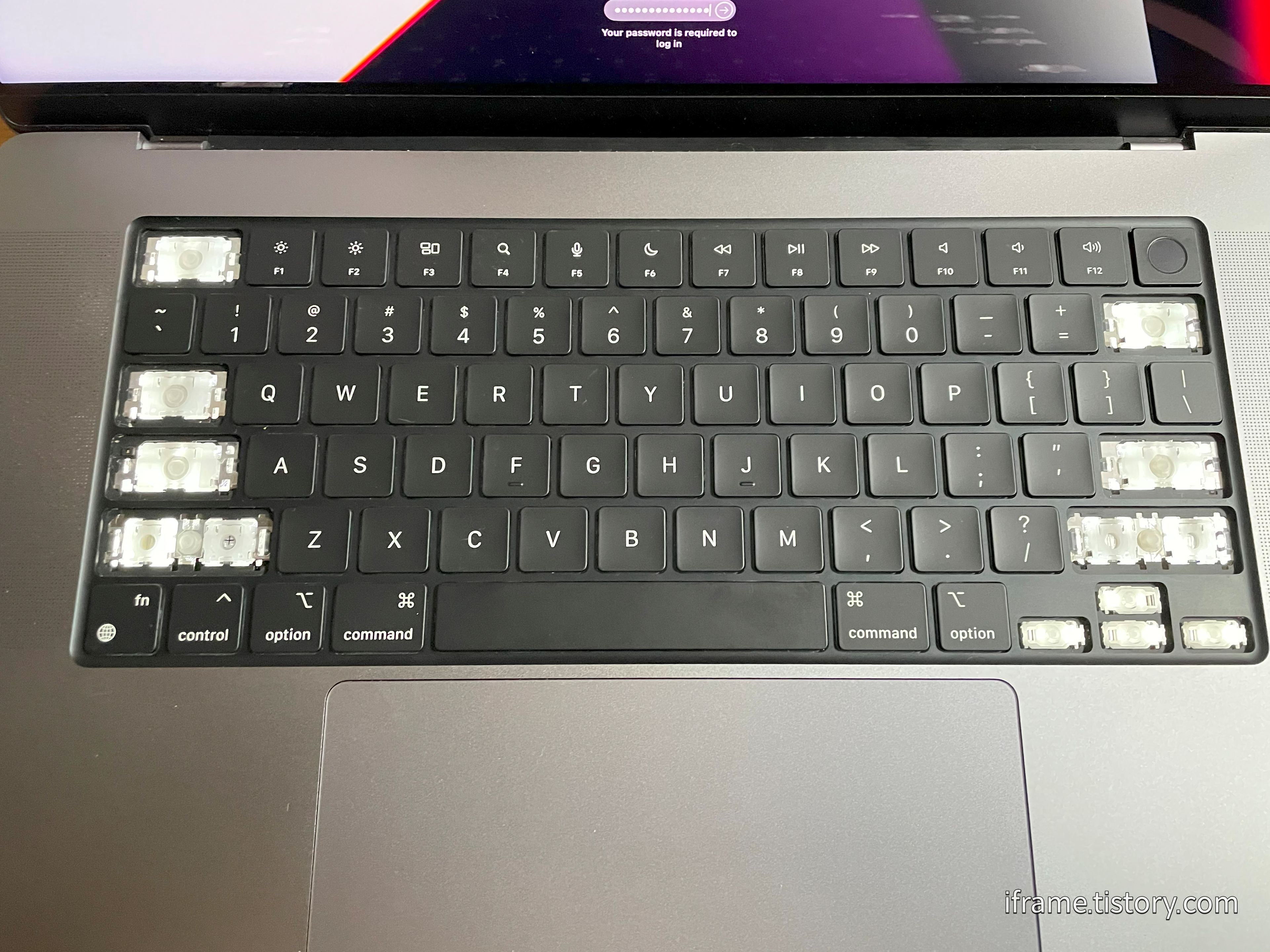알파 열과 숫자 열은 분리했고, 이후 다른 기능 키 열도 분리했습니다. 스페이스 바는 끼는 것도 어렵지만 빼는 것도 쉽지 않더라고요. 우측 상단의 Touch ID가 있는 부분은 분리하지 않습니다.