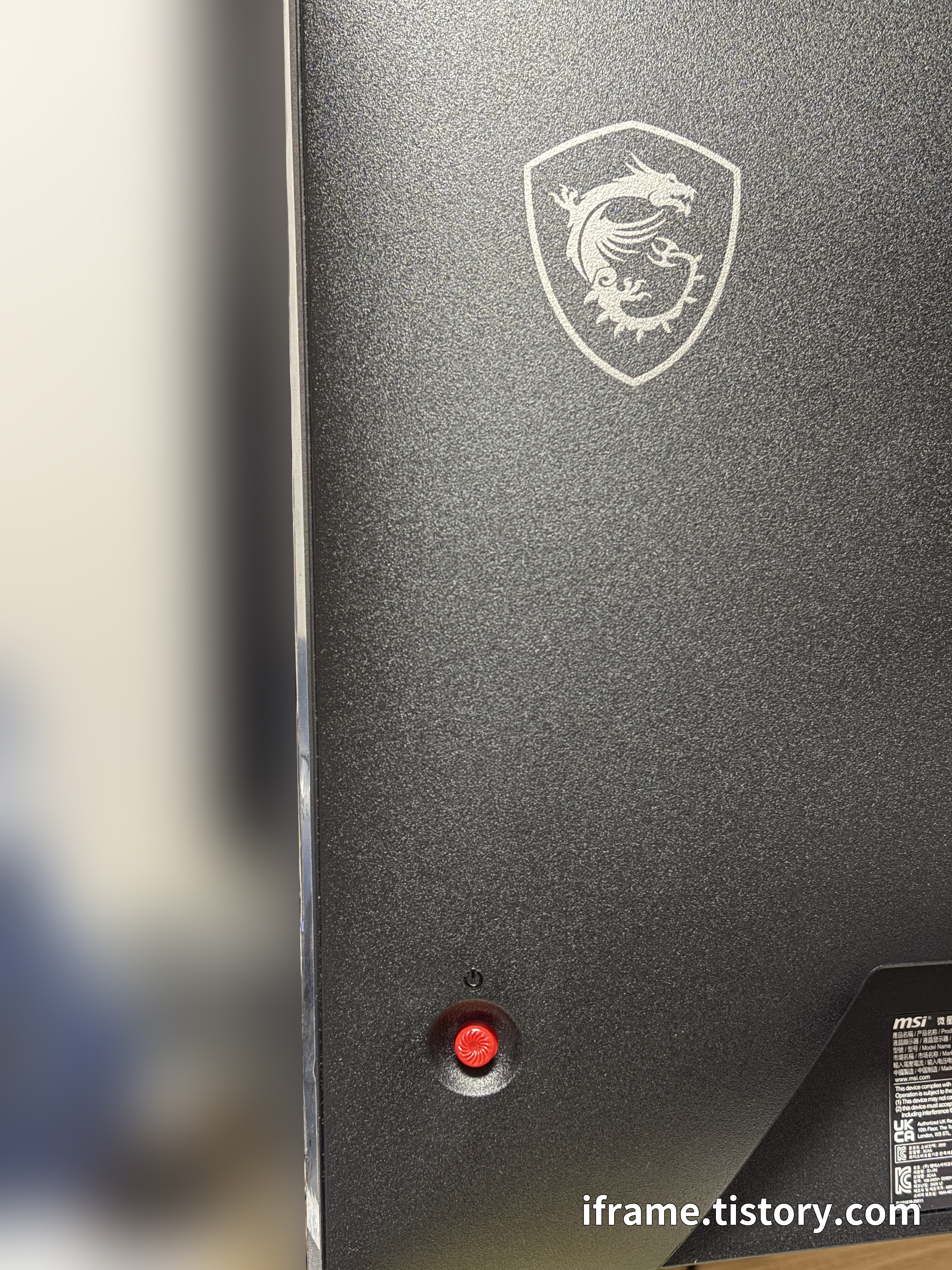 처음에는 저거만 보고 배젤이 넓었나? 싶었지만, 테이프(우측 하단)를 뜯으면 베젤 자체는 거슬릴 정도로 두껍지 않습니다. 오히려 프레임이 하단 msi 로고가 있는 면에만 있으니(플라스틱 프레임) 화면을 끄면 그냥 베젤이 티가 안 난다는 점.